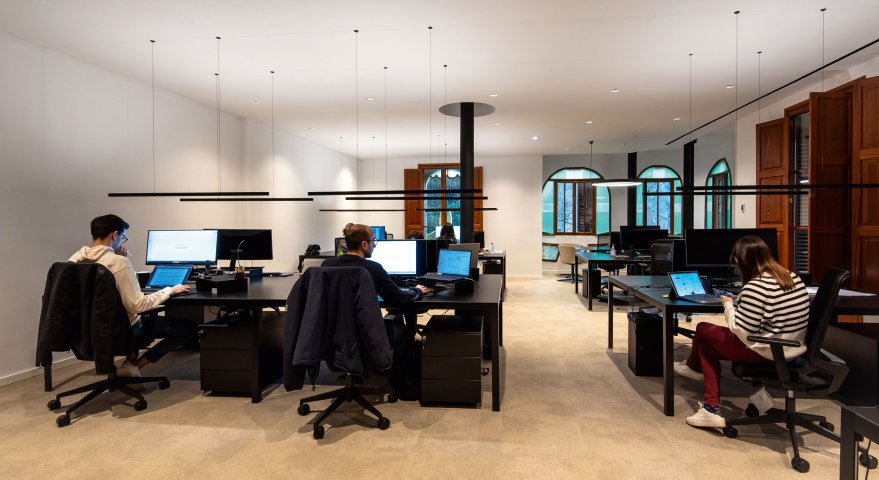 The intervention has consisted of adapting these two floors into the offices of a family office. On the second floor, there are 12 workstations and the office of the Chief Investment Officer. On the third floor, there is the office of the Chief Business Officer, a meeting area, and the boardroom.